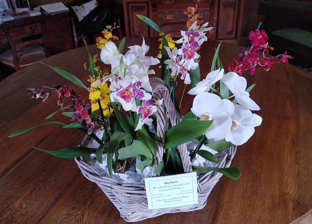 | Barbara's Orchids Although Celia and I decided not to attend Barbara Kitchen's funeral, we took this basket of orchids to the undertakers on behalf of the CANWOS members who joined with us to provide this floral tribute. These were not cut flowers but whole plants. The family hope to grow some of them on in Barbara's memory. From Iain Wright on 05/10/2020 |